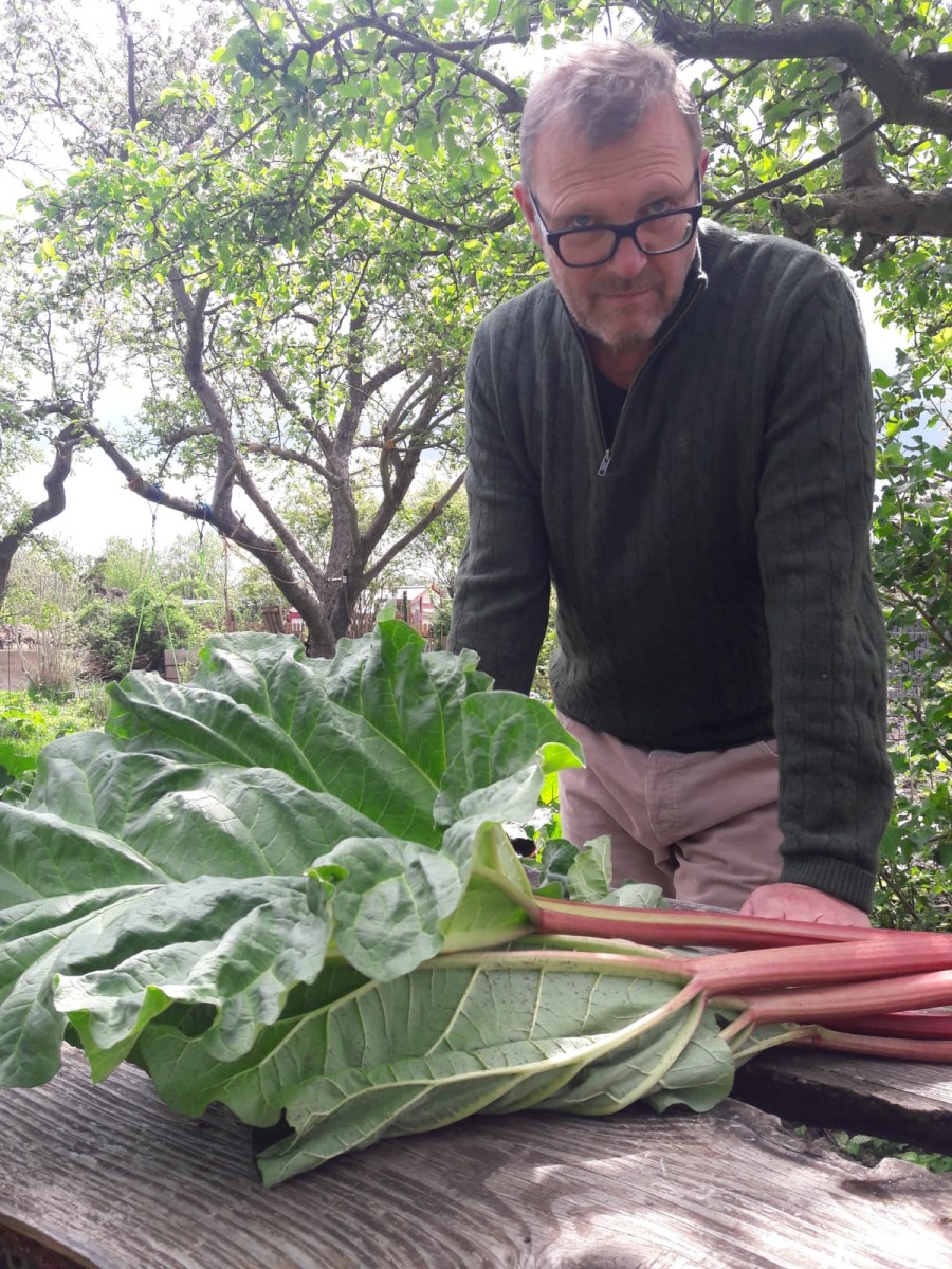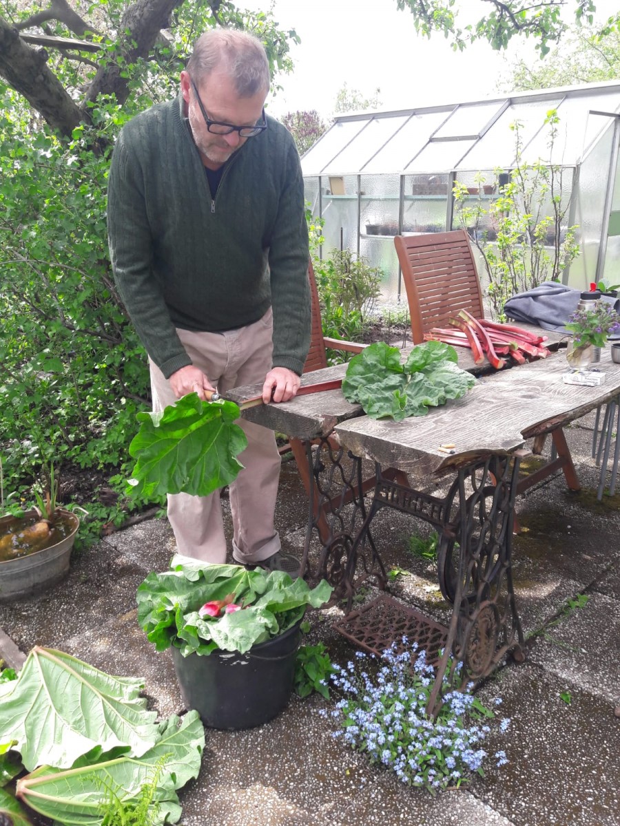 So Anfang Juni läuft die Rhabarberernte ja auf Hochtouren. Was an Blattwerk im März ja noch ganz putzig aussah, muss nun mehr oder weniger gerodet (und verarbeitet) werden, sonst kommt man nicht mehr durch. Die Blätter lappen mal selbstbewusst, mal selbstvergessen auf die Wege und das geht nun ja nicht. Vor zwei Jahren war an der Stelle wo jetzt der Rhabarber wächst noch ein Durcheinander von Himbeeren, Giersch und Ackerwinde. Der Rhabarber hat das survival of the fittest für sich entschieden und wuchert nun seinerseits. Der Halbschatten bekommt ihm außerordentlich gut.